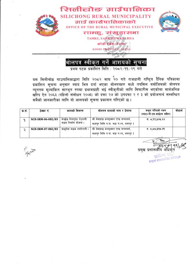 » बोलपत्र स्वीकृत गर्ने आशयको सूचना।
