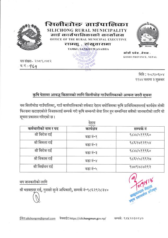 कृषि पेशामा आवद्ध किसानको लागि सिलीचोङ गाउँपालिकाको अत्यन्त जरुरी सूचना।