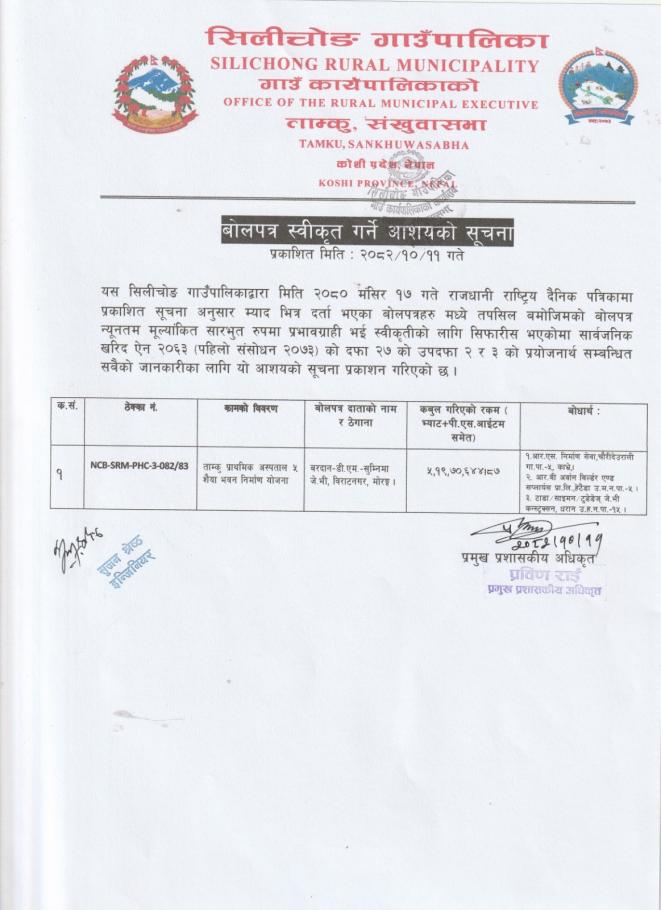 » बोलपत्र स्वीकृत गर्ने आशयको सूचना ।
