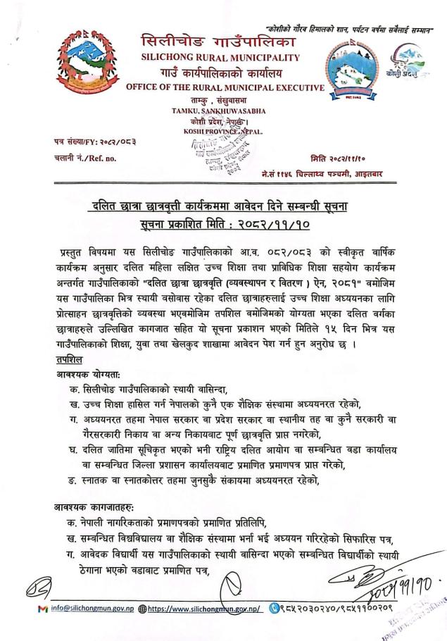 दलित छात्रा छात्रवृत्ति कार्यक्रममा आवेदन दिने सम्बन्धि सूचना ।